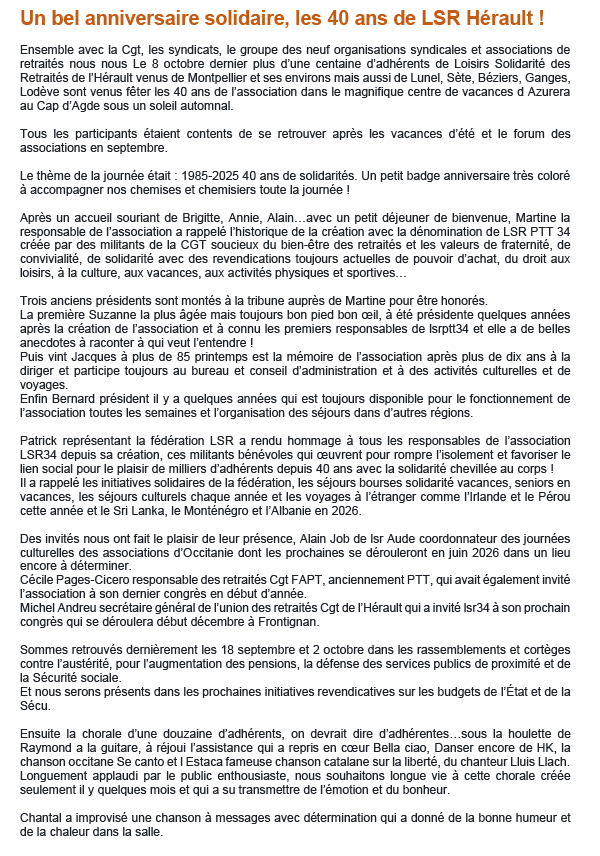 LSR 31 Toulouse,Nous étions 45 pour partir dans les Hautes Alpes à Chorges. Notre séjour s’est bien passé dans la joie, la bonne humeur et de nombreuses visites dans les lieux comme Embrun, Briançon, le col du Lautaret, autour du Lac de Serre Ponçons et son histoire ! Sur la photo, avant le départ en bateau sur « la Carline » et la possibilité de diriger le bateau : nous avions mis pour l’occasion la casquette du capitaine ! L S R Hérault : un bel anniversaire !